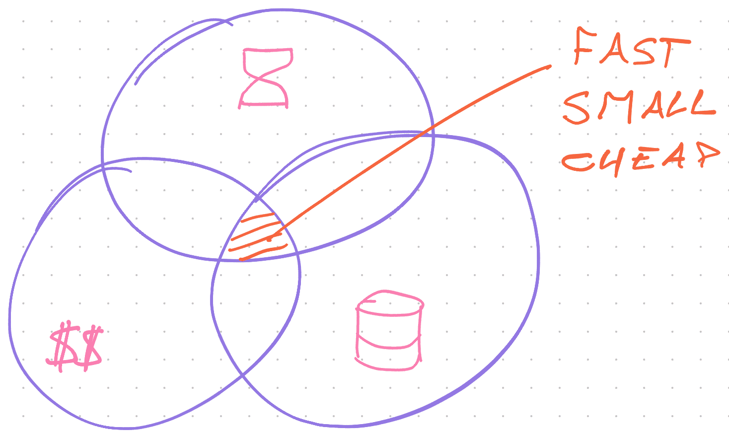 You can think of performance as a 4-dimensional optimization function. Speed vs. space vs. money vs. effort. Great question for a calculus exam.